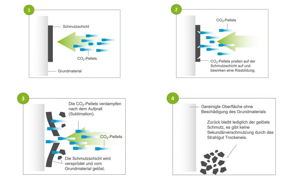 Beim Aufprall vergrößern die Trockeneis-Pellets ihr Volumen um das 760-fache und „sprengen“ die Schmutzpartikel von der Oberfläche ab.