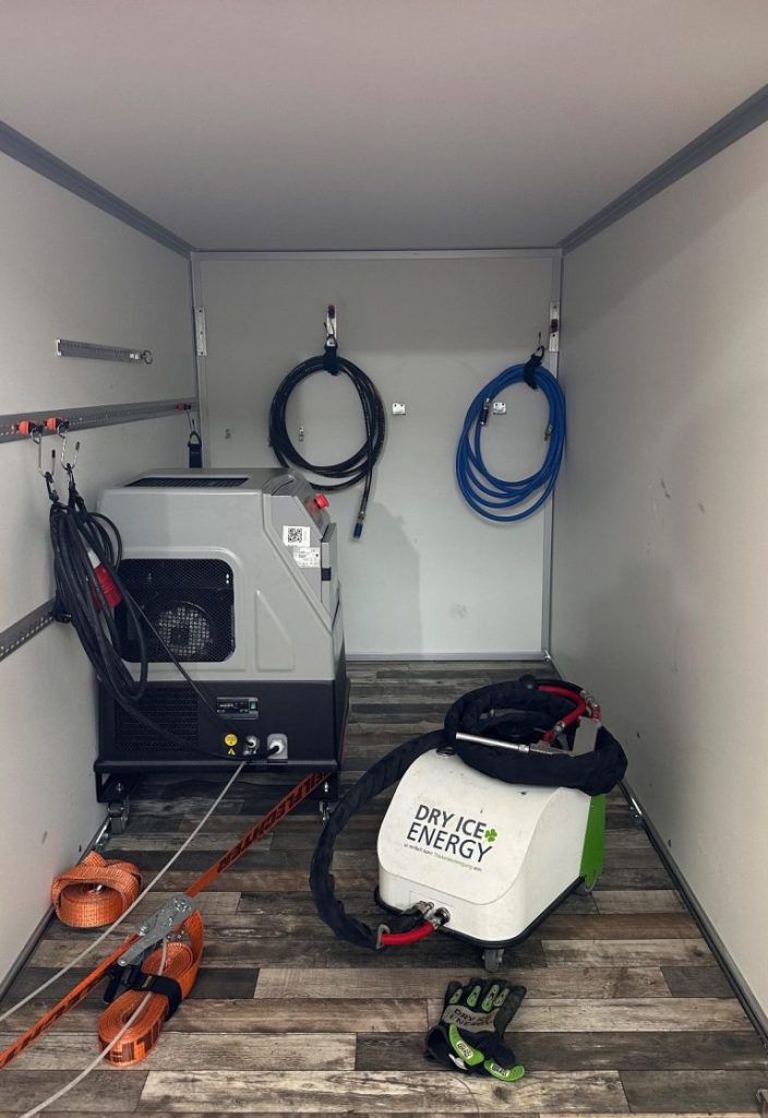 Mieten Sie unsere Trockeneisstrahlmaschine und erledigen Sie Ihre Reinigungsarbeiten ganz flexibel & kosteneffizient. Unser Set befindet sich auf einem 750 kg Anhänger, sodass Sie sich den umständlichen Transport eines schweren Kompressors sparen. Einfach abholen oder liefern lassen, anschließen und loslegen!